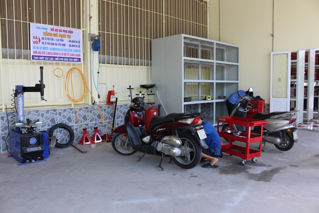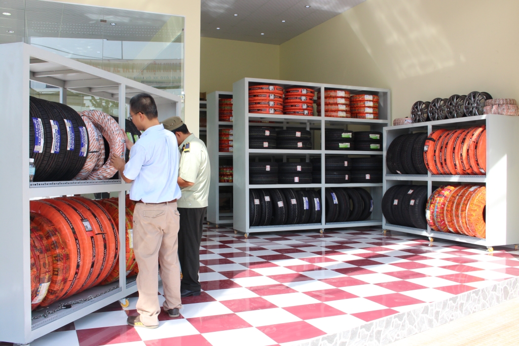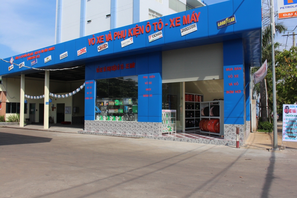 Cửa hàng chuyên doanh dịch vụ mua bán vỏ xe, ruột, yếm, mâm ô tô – xe máy các loại với các thương hiệu nổi tiếng như : Brigestone, Yokohama, Casumina, Kumho, Michelin, DRC, Duro … cùng với các dịch vụ vá vỏ, bơm hơi, thay nhớt xe và Cân mâm, bấm chì bằng máy chuyên dùng.